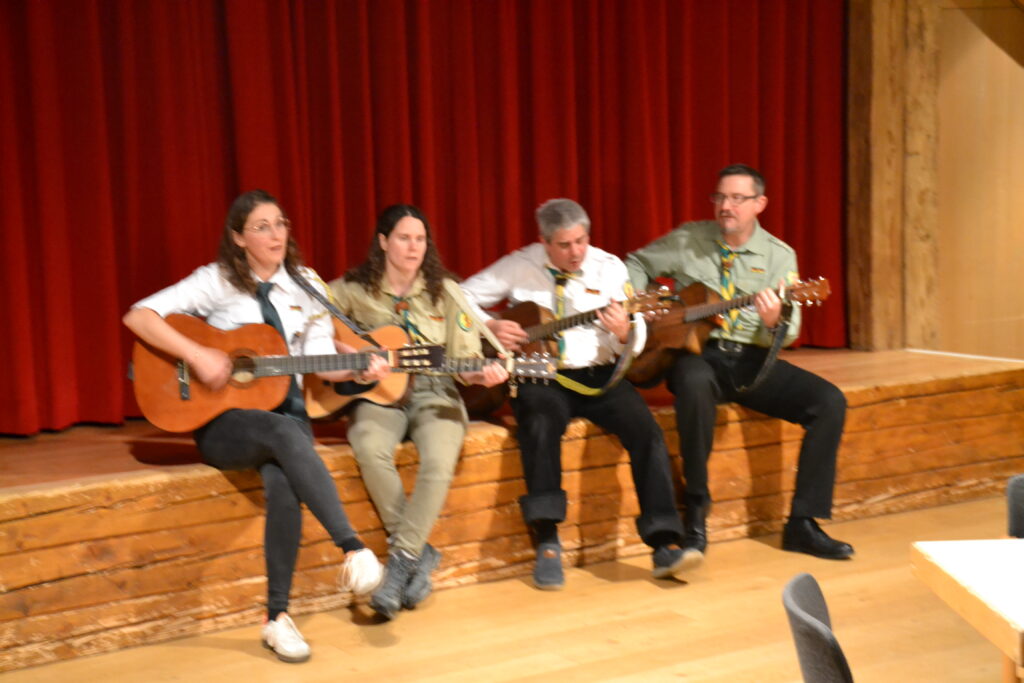 Danach ist es endlich geschafft, alle Reden sind vorbei und auch bei der Bundesleitung fällt die Anspannung ab. Der Stamm Lechscouts präsentiert einen selbst gedrehten Film und die Bundesleitung veranstaltet eine Quizshow. Der Abend klingt mit vier Gitarren aus und geht in einen Singkreis und angeregten Austausch mit neuen und alten Gesichtern über.