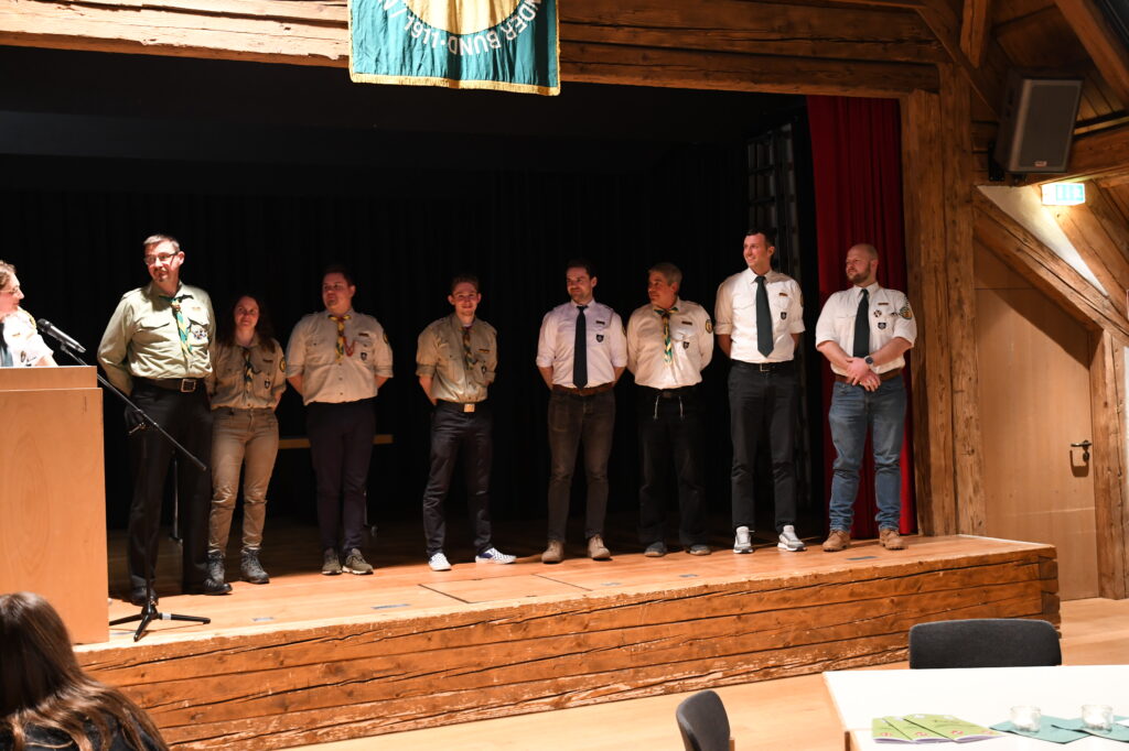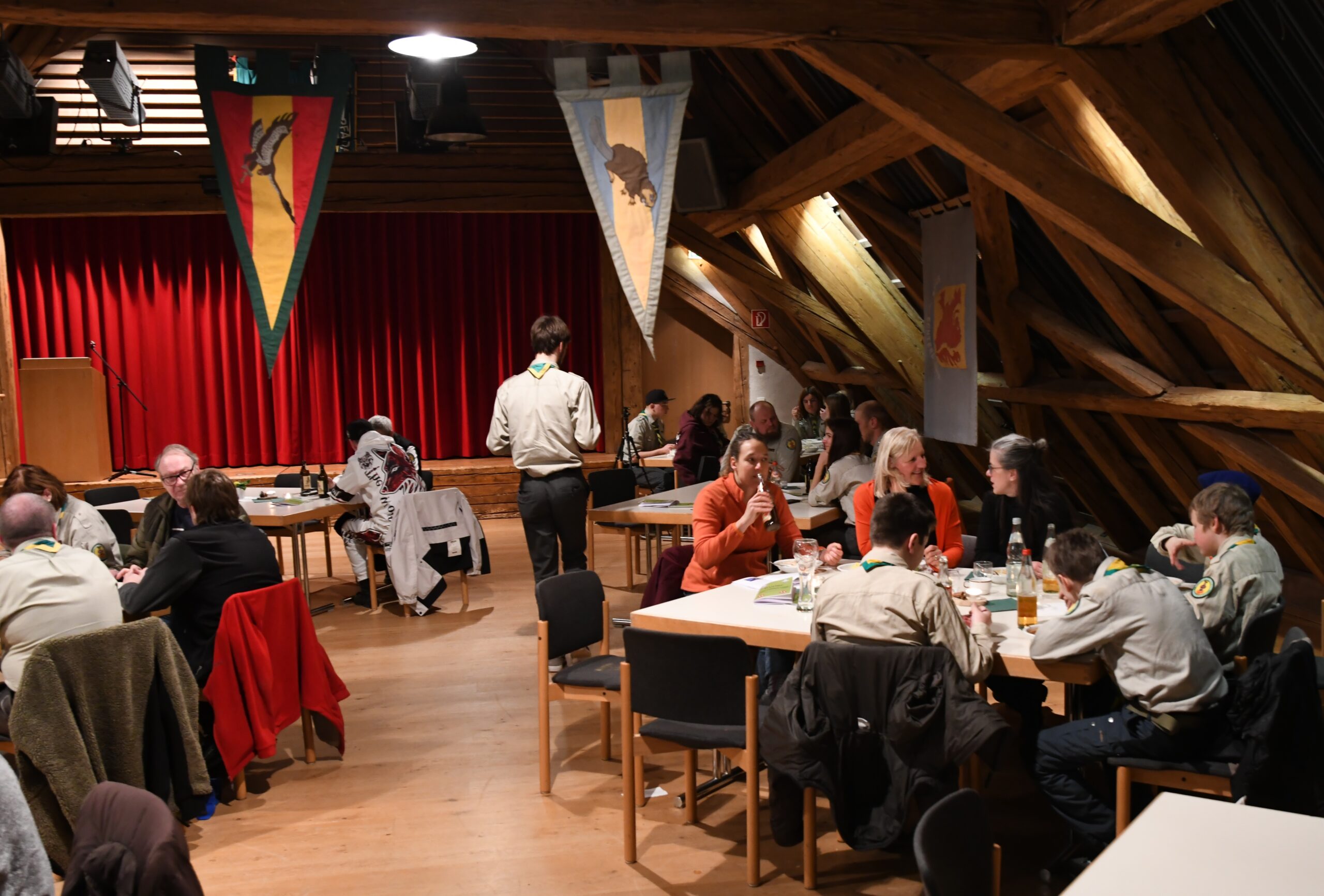 Gegen 17 Uhr sitzt die Festtagskluft, die Krawatte ist gebunden und die ersten Gäste treffen in der alten Zehntscheuer in Plieningen ein. Neben leckerem Chili und Maultaschensuppe standen Ehre und Dank im Mittelpunkt. Nach einer Rede von BfM Kathi, die das alte Jahr Revue passierte, wurden die Stammesleiter, Janne als Bundesrüstkämmerer sowie der Altpfadfinder Wolfgang in Ernennungen und Ehrungen bedacht. Momente der Dankbarkeit, des Stolzes und der Freude machen sich breit.